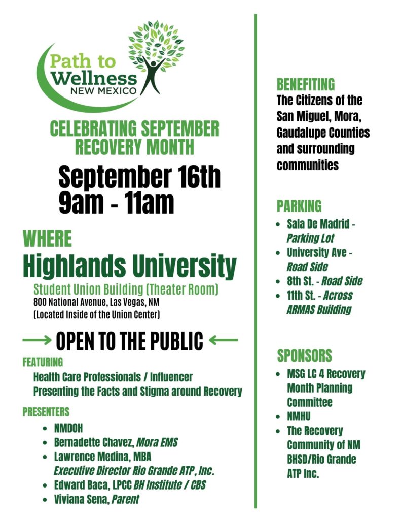 Help us Celebrate Recovery Month Path to Wellness on Friday, September 16th, 9:00 to 11:00 am at New Mexico Highlands University Theater 800 National Avenue, Las Vegas, NM located inside of the Student Union Center. Health Care Professionals and Influencers will present facts regarding use of fentanyl, harm reduction, peer support, stigma, supportive employment, and personal stories with a focus on stigma and other substance content. Registration begins at 8:30 and is FREE and open to the public! Recovery is For Everyone: Every Person, Every Family, Every Community. Today can be the day to begin a good and healthful life. For more information contact: Debbie Rivera or Valentina White at Public Health Office 505-425-9368.